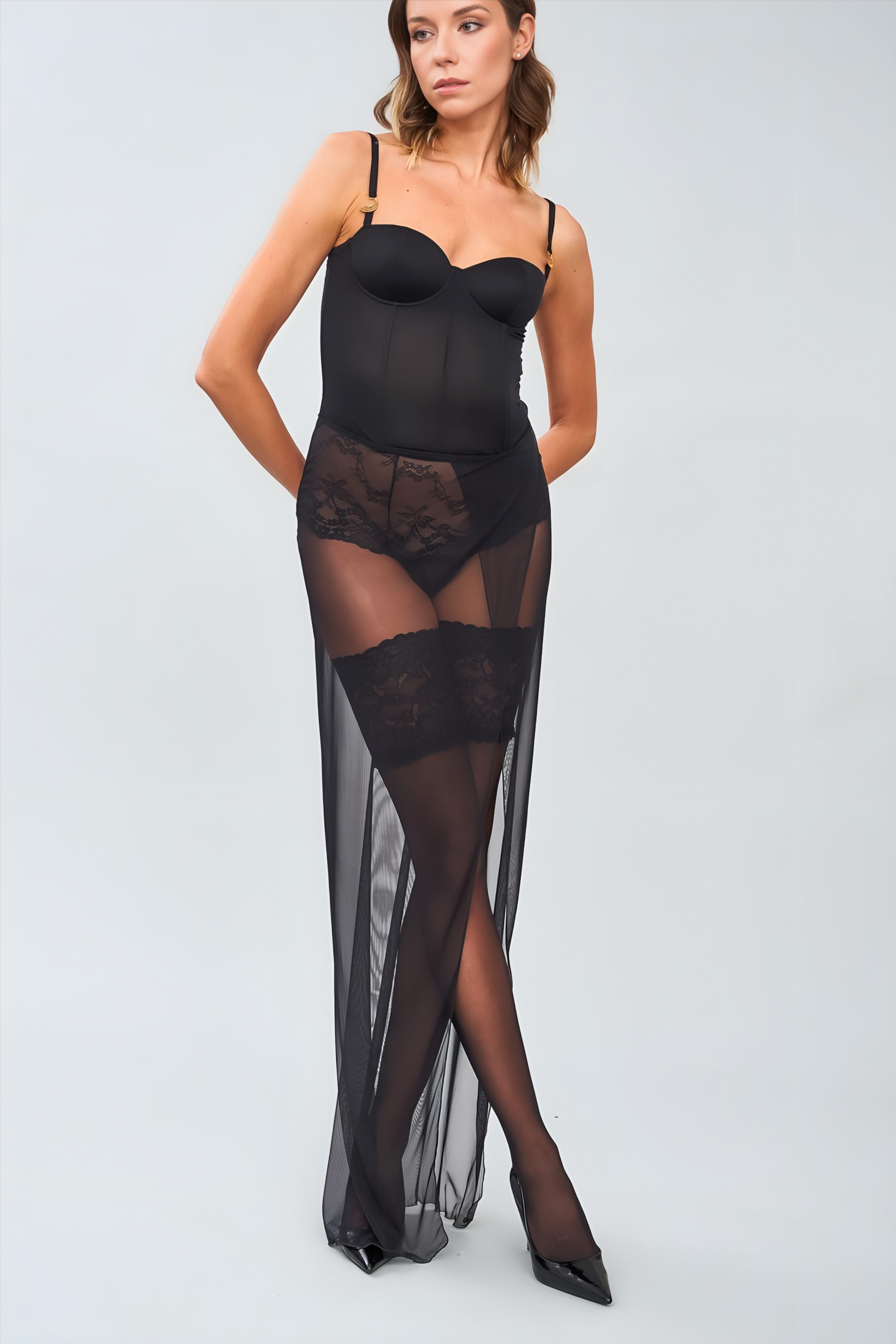 Elegante vestido corsé negro elaborado en tul semitransparente con tirantes ajustables y detalles bañados en oro, diseñado para un encanto sofisticado y ocasiones especiales.