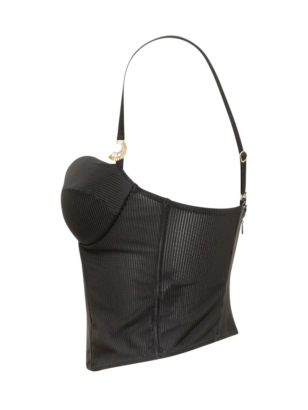 Striking black corset top with ribbed fabric construction and golden detail accents.
