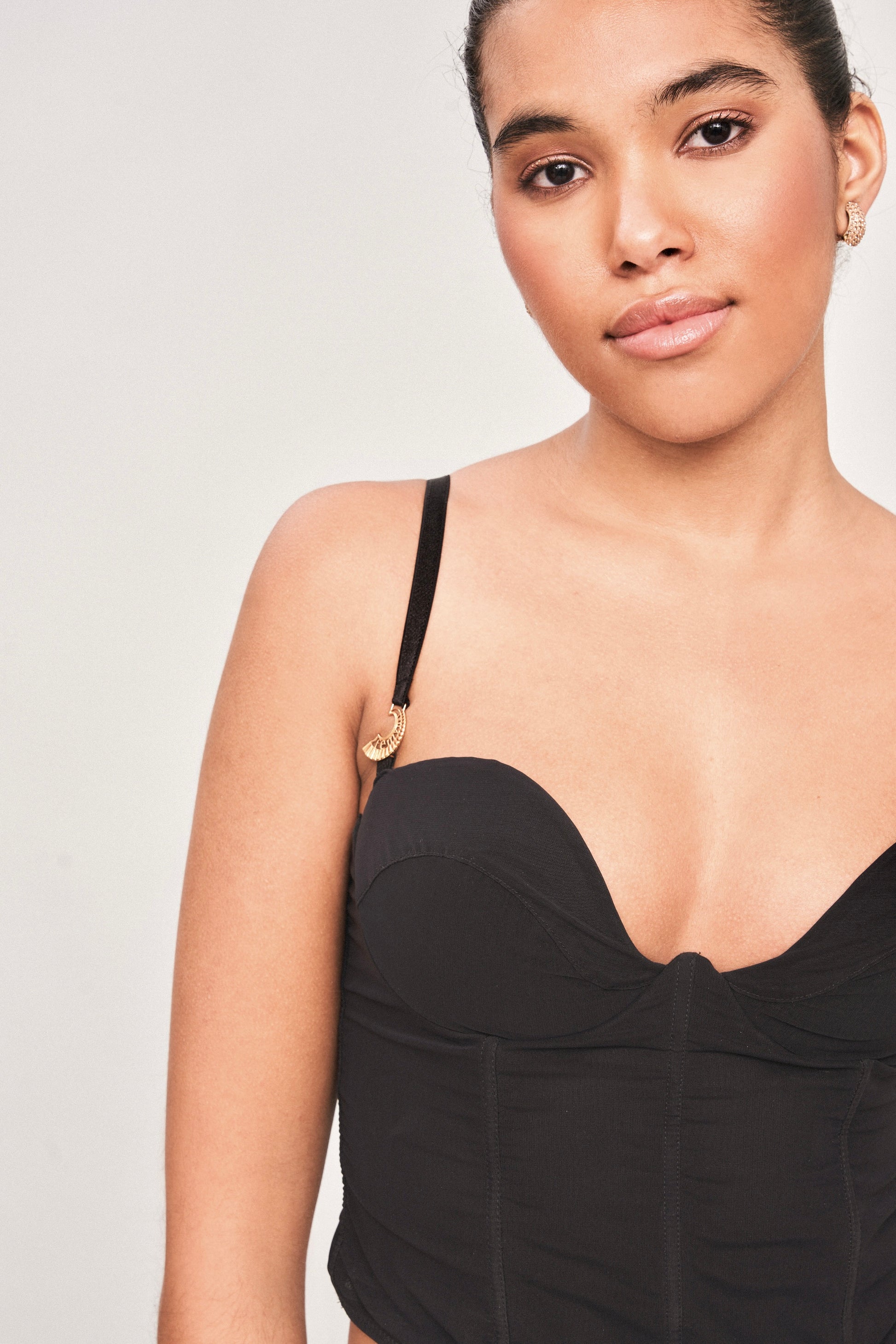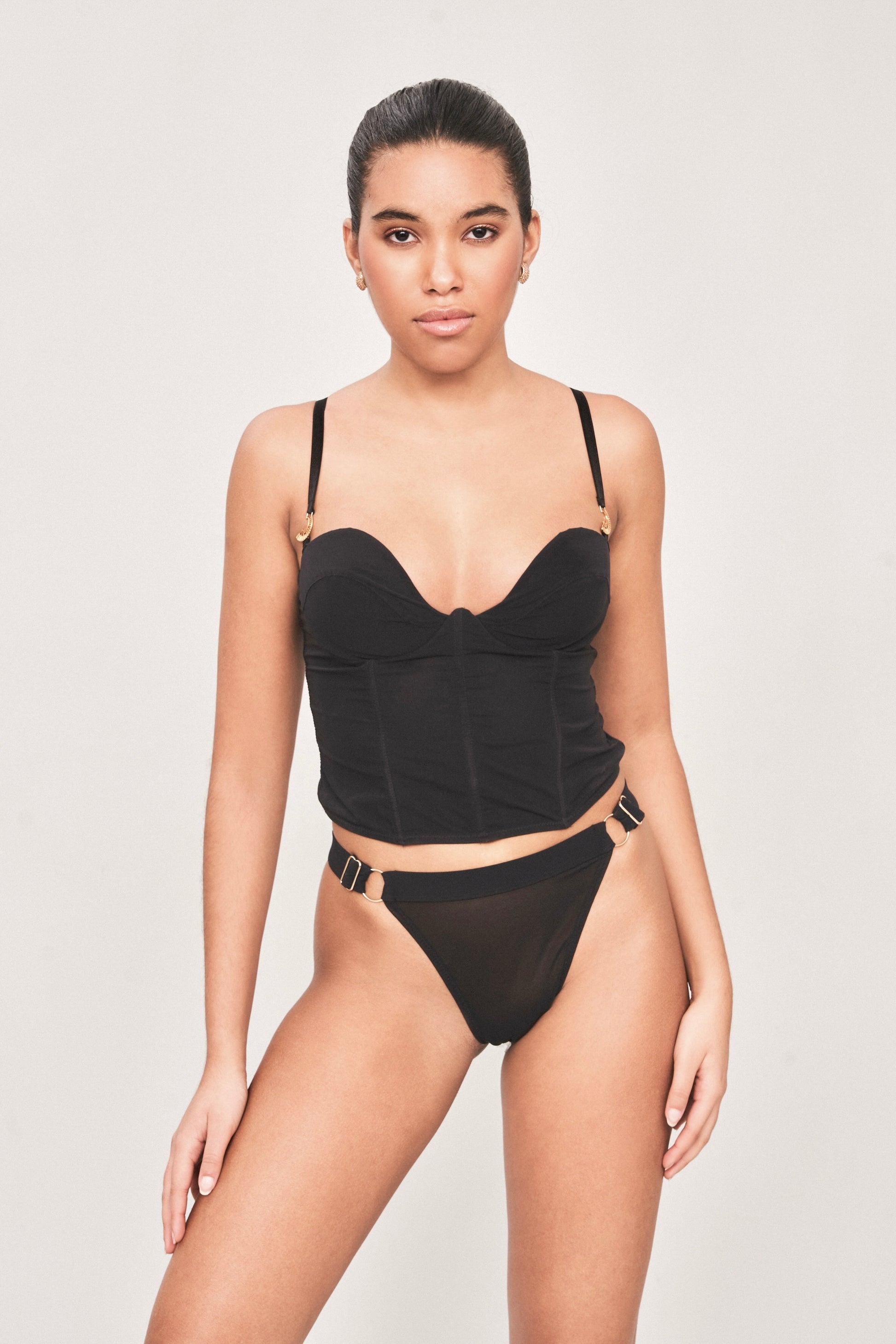 Realizzato in tessuto costinato di alta qualità, questo corset top nero presenta raffinati dettagli dorati che aggiungono un tocco di lusso ad ogni look.