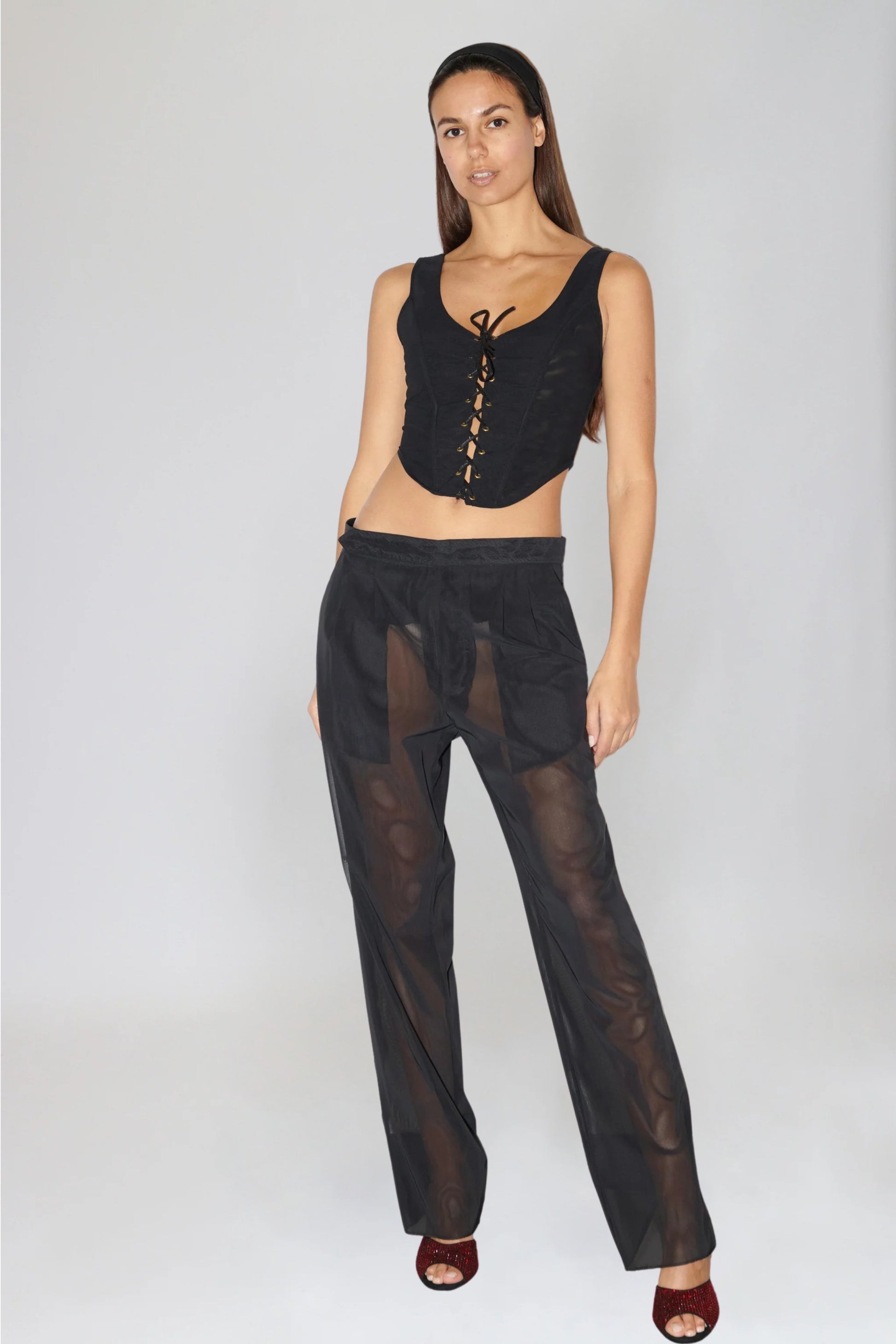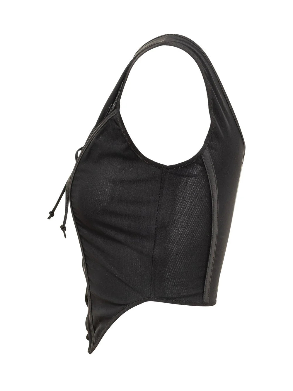 Elegant black tulle corset with wide straps and central lace closure for adjustable fit.