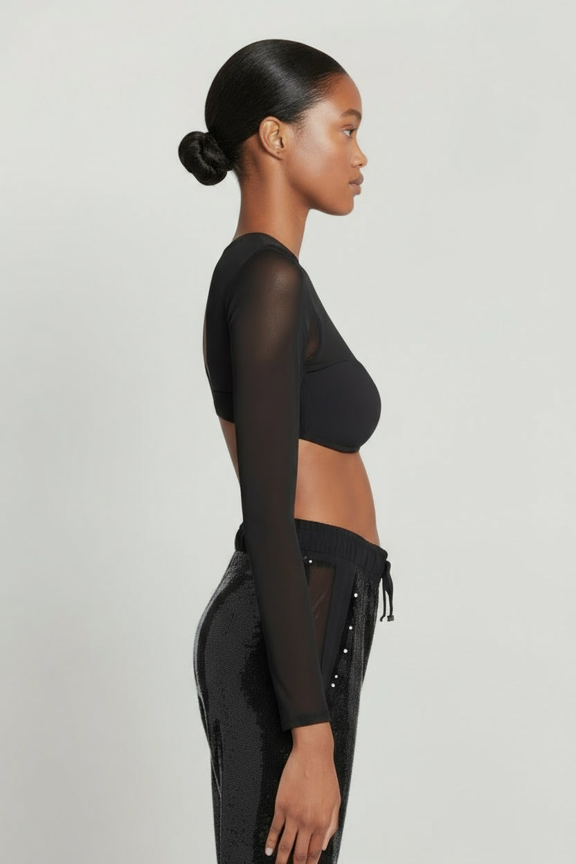 Elevate your evening wardrobe with this sophisticated mesh tulle crop top, featuring an integrated bra for seamless support and style. Crafted from premium sheer tulle with long sleeves, this piece combines elegance with contemporary design.