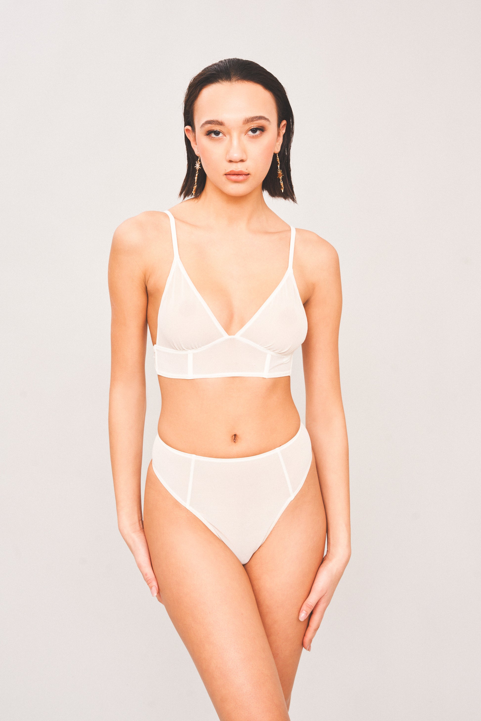 Elegant semi-transparent lingerie set with bustier-style bralette and high-waisted bottom.
